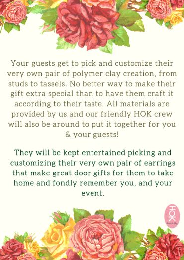 They will be kept entertained picking and customizing their very own pair of polymer clay earrings that make great door gifts for them to take home and fondly remember you, and your event. All materials are provided by our team and our friendly HOK crew will also be around to put it together for you & your guests!
